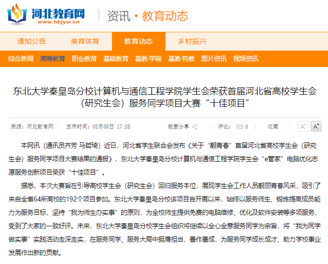 近日,河北省学生联合会发布《关于“靓青春”首届河北省高校学生会(研究生会)服务同学项目大赛结果的通报》,365官网365上市公司官网学生会“e管家”电脑优化志愿服务创新项目荣获“十佳项目”。