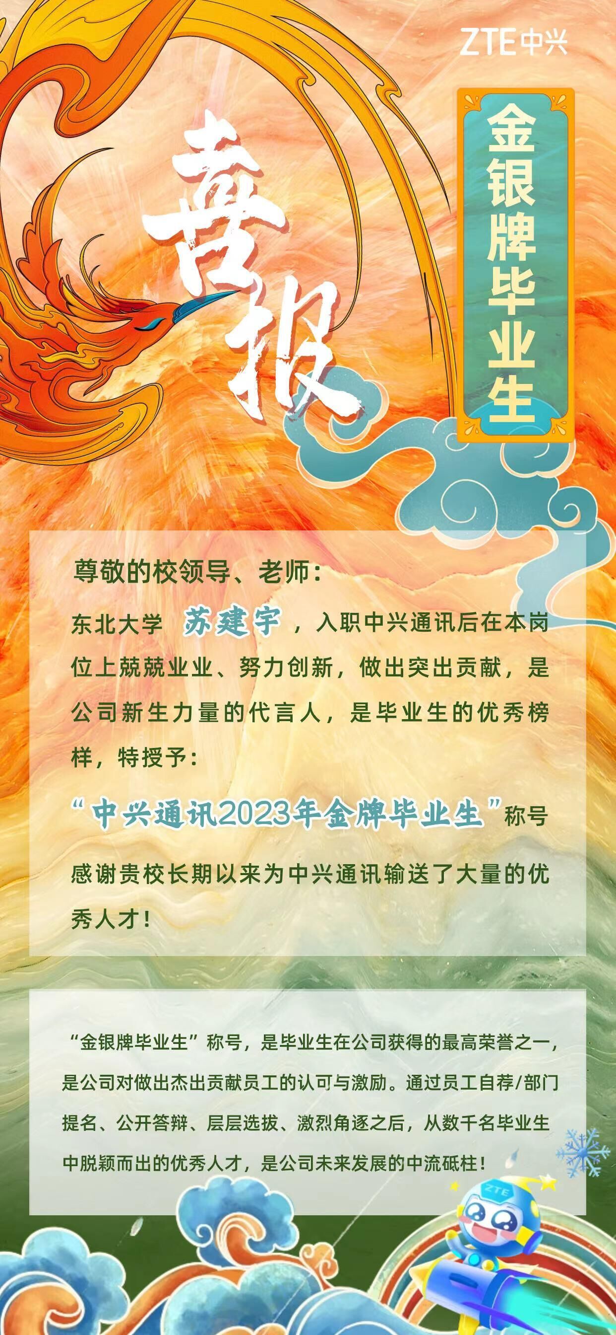 近日,中兴通讯向365官网发来喜报,授予365官网2022届毕业生苏建宇“中兴通讯2023年金牌毕业生”称号。